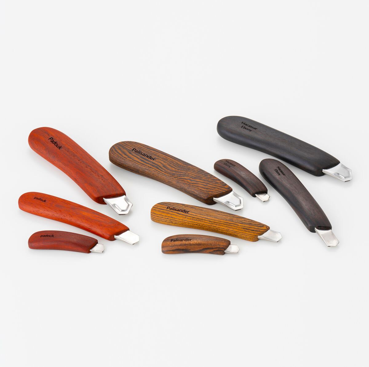 木肌が手に馴染む優しい握りここちの銘木材を使用したカッターナイフです。手にすると「ホッ」とするような温かみを感じられ、便利で使いやすいと好評をいただいています。