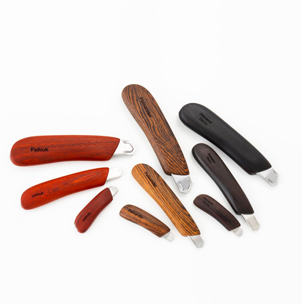 木肌が手に馴染む優しい握りここちの銘木材を使用したカッターナイフです。手にすると「ホッ」とするような温かみを感じられ、便利で使いやすいと好評をいただいています。